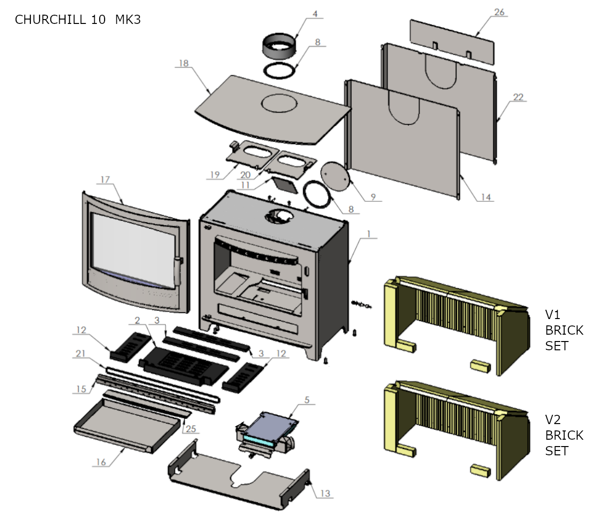 V1 Brick Set : Present in stoves produced from March 2015 to Feb 2015 - MK3 Version 1 can be distinguished from Version 2 by the rear bricks measuring 245mm high.