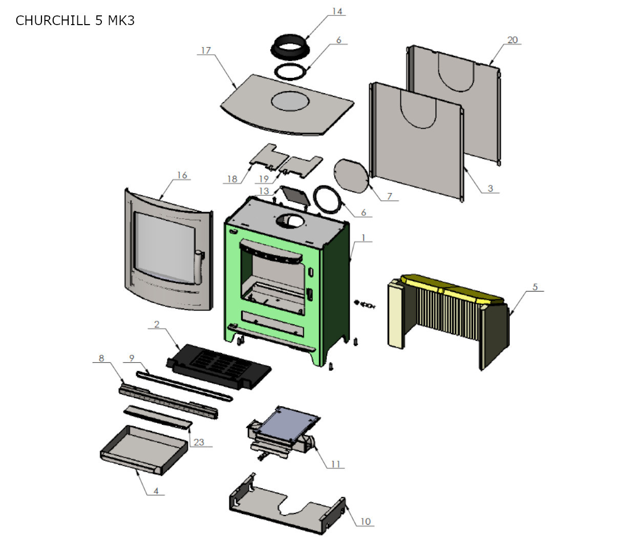 Below you will find exploded diagrams of the Churchill 5 MK3 spare parts, this stove was available between March 2014 and May 2016.