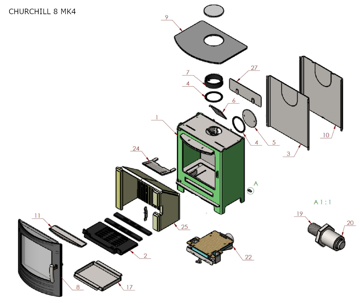 Below you will find exploded diagrams of the Churchill 8 MK4 spare parts, this stove was available from April 2019 onwards.