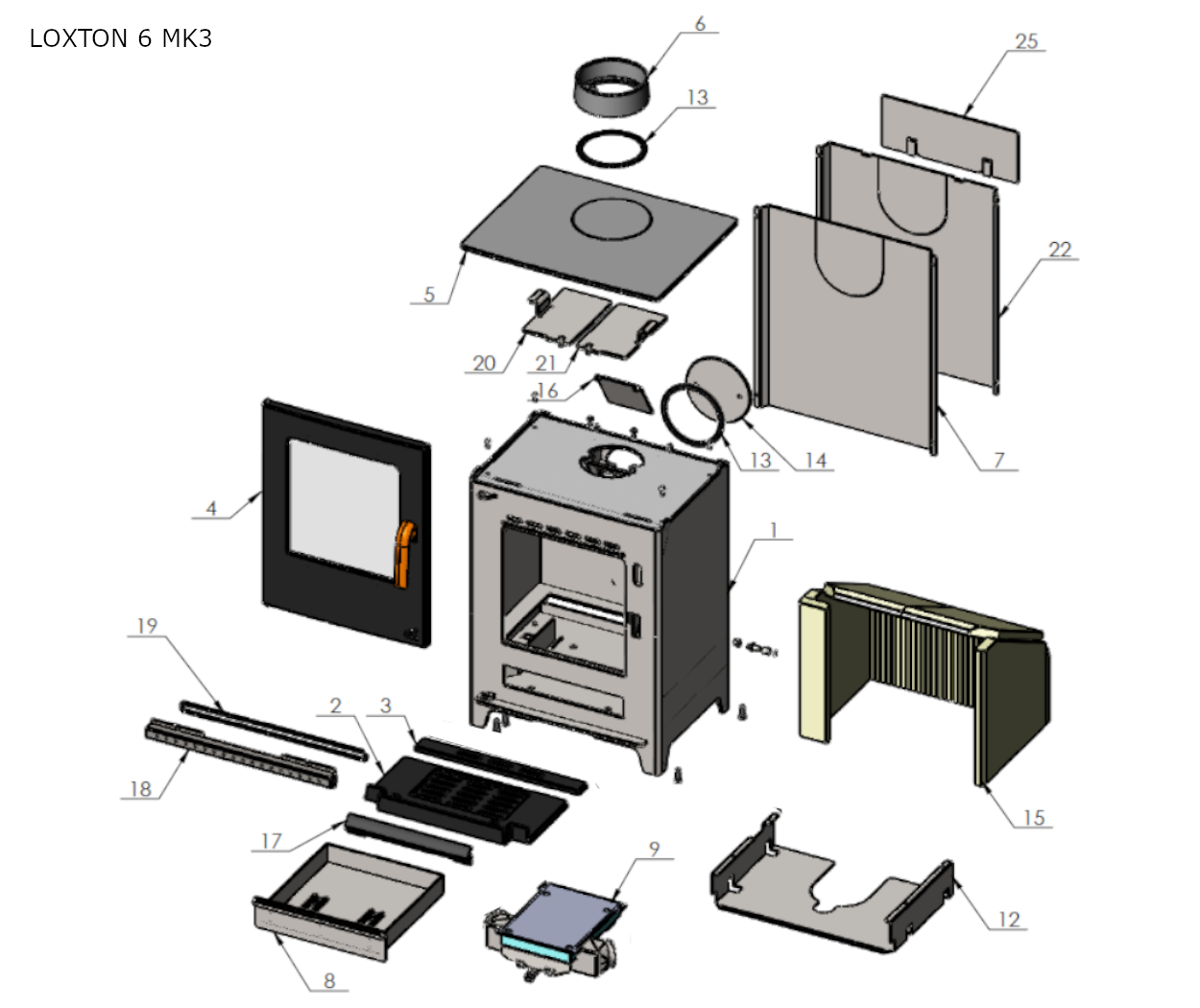 Below you will find exploded diagrams of the Loxton 6 MK3 V2 Spare Parts, this stove was available between May 2018 and December 2018. This model is easy to distinguish from the MK3 V1 version as it has flat sides to take logstore legs, and larger glass than the MK3 V1 model.