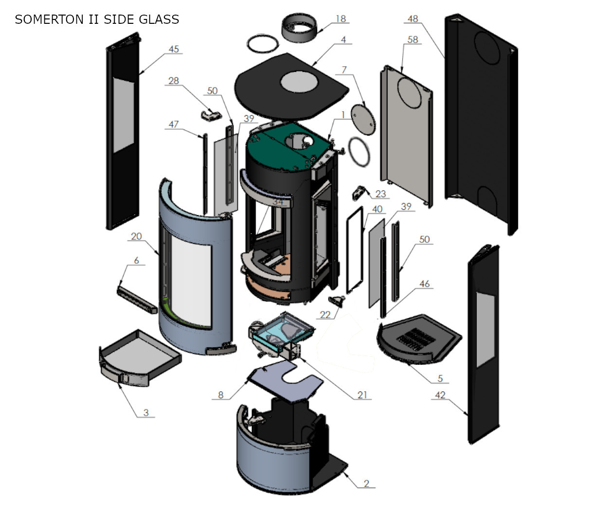 Below you will find exploded diagrams of the Somerton Side Glass spare parts, this stove was available between November 2016 and March 2019.