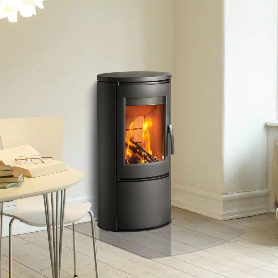 Elegant, modern, and effortlessly efficient – the Varde Shape 2 is a contemporary wood burning stove designed to be the focal point of any living space. With its sleek cylindrical form, tall fire chamber, and large curved glass window, it offers a captivating view of the flames from all angles.